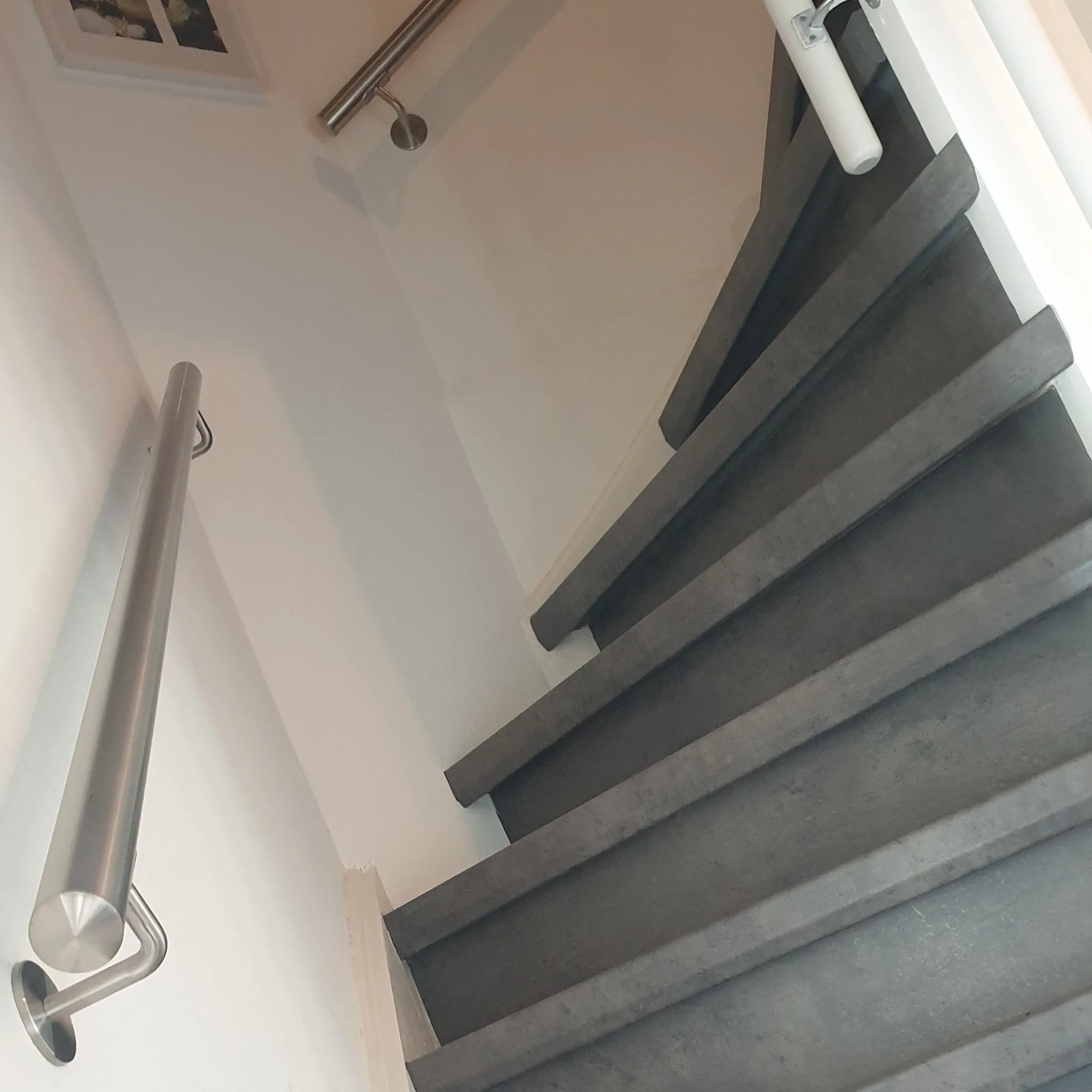 Ein runder Handlauf aus Edelstahl V2A (304) gebürstet mit einem Durchmesser von 42,4 mm. Ein klassischer Treppenhandlauf mit populäre Typ 3 Halterungen. Dieses Treppengeländer wird nach Maß gefertigt & mit den kompletten Befestigungsmaterialien geliefert. Lesen Sie mehr