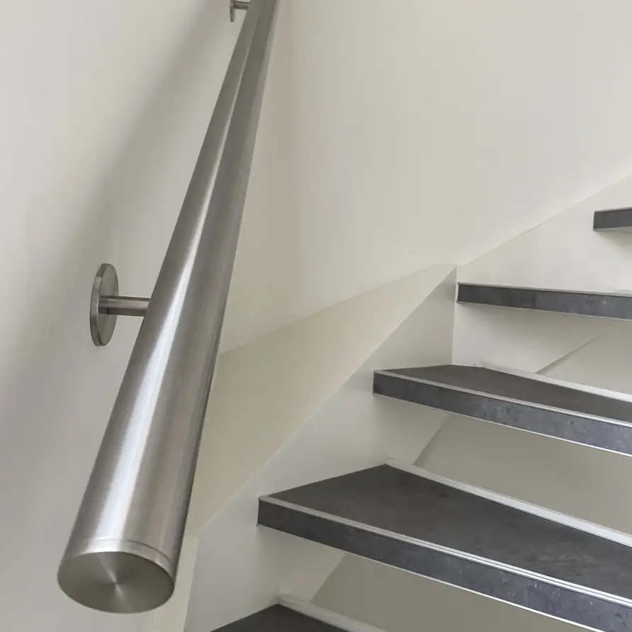 Ein runder Handlauf aus Edelstahl V2A (304) gebürstet mit einem Durchmesser von 42,4 mm. Ein klassischer Treppenhandlauf mit trendigen Typ 3 Luxus Halterungen. Dieses Treppengeländer wird nach Maß und mit den kompletten Befestigungsmaterialien geliefert. Lesen Sie mehr