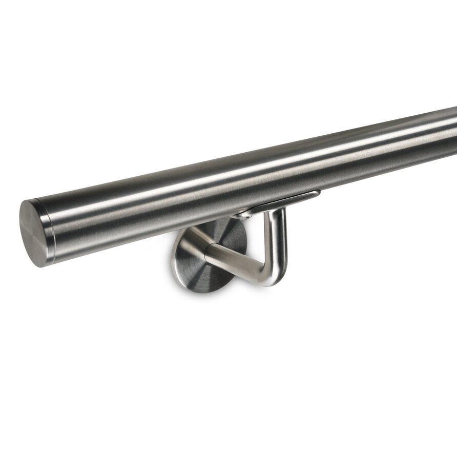 Handlauf Edelstahl - rund schmal - inklusive Handlaufträger Typ 3 + Befestigungsmaterial - nach Maß. Ein runder schmaler Handlauf aus Edelstahl 304 gebürstet (für drinnen) mit einem Durchmesser von 33,7 mm. Sie erhalten dieses Treppenhandlauf-Set mit Stützen Typ 3, inklusive aller benötigten Befestigungsmaterialien: 1 Edelstahl Stockschraube M8 + 1 Dübel rund M10 und 2 Edelstahl Innensechskantschrauben M5 (pro Halter).