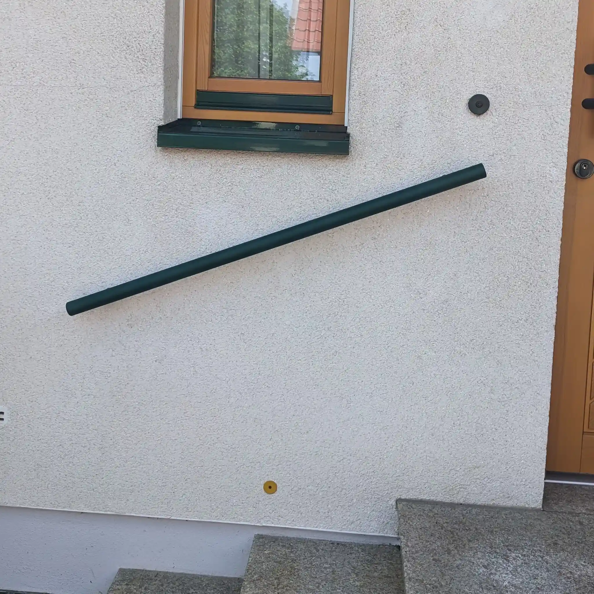 Handlauf in RAL-Farbe nach Wunsch Komplettset - rund - inklusive Handlaufträger Typ 14 + Befestigungsmaterial - nach Maß - von 30-595 cm - speziell für den Außenbereich (Ihre Außentreppe) - Treppengeländer Metall mit Pulverbeschichtung fein strukturiert (matt) - erhältlich in allen RAL-Farben. Ein runder Handlauf mit einem Durchmesser von 42,4 mm in einer RAL Farbe Ihrer Wahl. Dieser Handlauf aus Stahl wird mit einer hochwertigen, fein strukturierten Pulverbeschichtung versehen, wobei Sie jede RAL-Farbe wählen können. Speziell um diesem Handlauf (betrifft auch die Halter) den optimalen Schutz für den Außenbereich zu geben, wird dieser Handlauf zweimal mit einer hochwertigen Pulverbeschichtung versehen. Ein ansprechender runder Treppenhandlauf aus Metall, stets in der richtigen Farbe, für eine perfekte Abstimmung mit Ihrer Gartengestaltung!