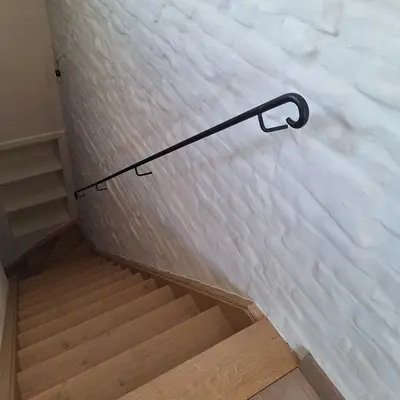 Ein schmiedeeiserner Handlauf mit runde Haltern. Ein Treppengeländer Schmiedeeisen mit modernem Akzent, perfekt für einen charakteristischen Touch in Ihrer Einrichtung. Lesen Sie mehr