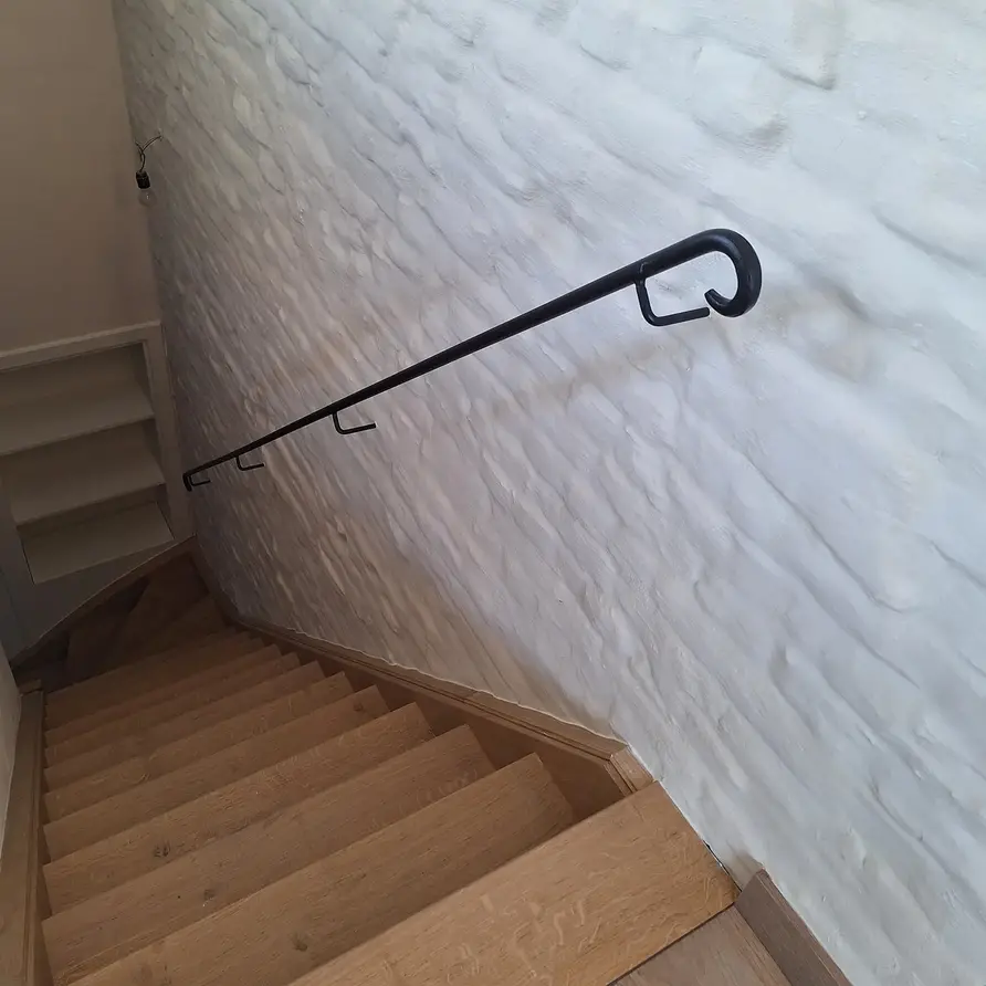 Ihr schmiedeeiserner Handlauf ist standardmäßig gerade verarbeitet. Sie können sich aber auch für eine authentisch geschmiedete Oberfläche mit einer robusten Stauchung und / oder zierlichen Schnecke entscheiden. Das ist auf jeden Fall eine Uberlegung wert, denn Sie setzen damit einen besonderen Akzent und bekommen einen außergewöhnlichen Handlauf. Die Stauchung und die Schnecke werden in traditioneller Schmiedekunst von einem professionellen Handwerker von Hand zugefügt. Sie können also deutlich den Effekt der Hammerschläge auf Ihrem Treppengeländer aus Schmiedeeisen sehen, sehr speziell!