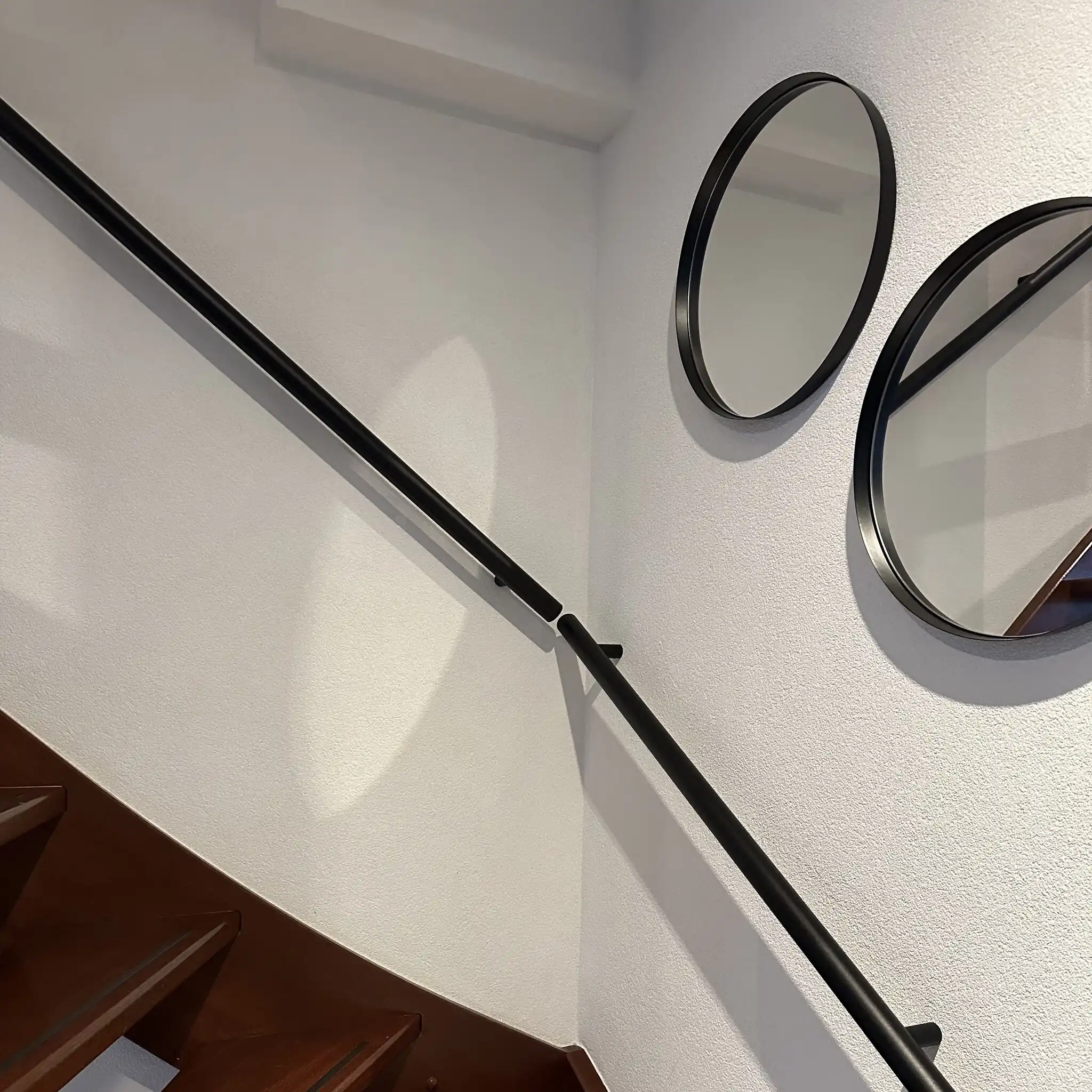 Ein runder Handlauf schwarz mit einem Durchmesser von 42,4 mm. Ein ansprechender Treppenhandlauf schwarz aus Metall mit schöne Typ 14 Halterungen. Dieses Treppengeländer wird nach Maß gefertigt und mit den kompletten Befestigungsmaterialien geliefert. Lesen Sie mehr