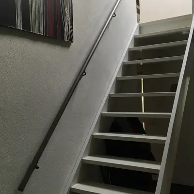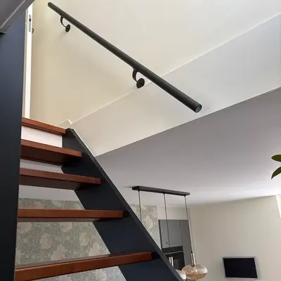 Ein runder Handlauf schwarz mit einem Durchmesser von 42,4 mm. Ein ansprechender Treppenhandlauf schwarz aus Metall ohne Halter. Dieses Treppengeländer wird nach Maß gefertigt. Lesen Sie mehr