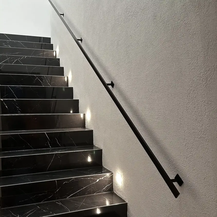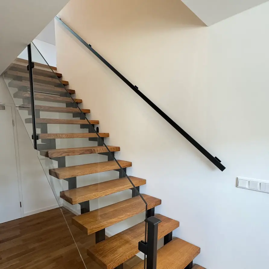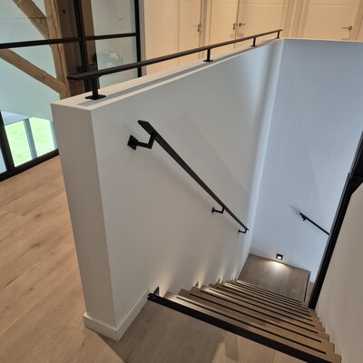 Ein Handlauf schwarz eckig von 40x10 mm: Ein schlanker Treppenhandlauf schwarz aus Metall mit geradlinige Typ 16 Halterungen. Dieses Treppengeländer wird nach Maß gefertigt und mit den kompletten Befestigungsmaterialien geliefert. Lesen Sie mehr