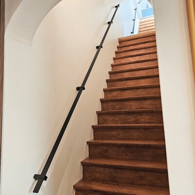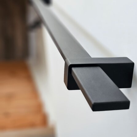 Ein Handlauf schwarz eckig von 40x10 mm: Ein schlanker Treppenhandlauf schwarz aus Metall mit geradlinige Typ 13 Halterungen. Dieses Treppengeländer wird nach Maß gefertigt und mit den kompletten Befestigungsmaterialien geliefert. Lesen Sie mehr
