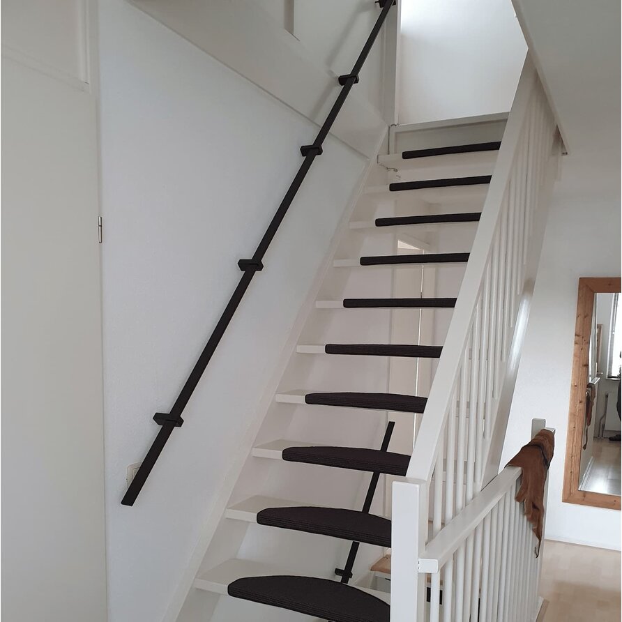 Handlauf schwarz Komplettset - eckig (40x10 mm) - inklusive Handlaufträger Typ 13 + Befestigungsmaterial - nach Maß - von 30 cm bis 595 cm - Treppengeländer Metall / Stahl beschichtet - RAL 9005. Ein Handlauf schwarz eckig von 40x10 mm. Dieser Handlauf aus Stahl wird mit einer schwarzen Pulverbeschichtung in der Farbe RAL 9005 versehen. Hierbei können Sie wählen zwischen glatt und fein strukturiert. Ein schlanker rechteckiger Treppenhandlauf schwarz aus Metall mit einem robusten Look, ideal geeignet für schlichte Innenräume.