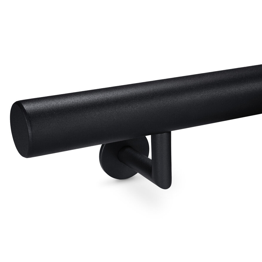 Handlauf schwarz Komplettset - rund - inklusive Handlaufträger Typ 3 Luxus + Befestigungsmaterial - nach Maß - von 30 cm bis 595 cm - Treppengeländer Metall / Stahl beschichtet - RAL 9005. Ein runder Handlauf schwarz mit einem Durchmesser von 42,4 mm. Dieser Handlauf aus Stahl wird mit einer schwarzen Pulverbeschichtung in der Farbe RAL 9005 versehen. Hierbei können Sie wählen zwischen glatt und fein strukturiert. Ein ansprechender runder Treppenhandlauf schwarz aus Metall mit einem robusten Look, welcher perfekt zu einem breiten Spektrum an Wohn- und Einrichtungsstilen passt.