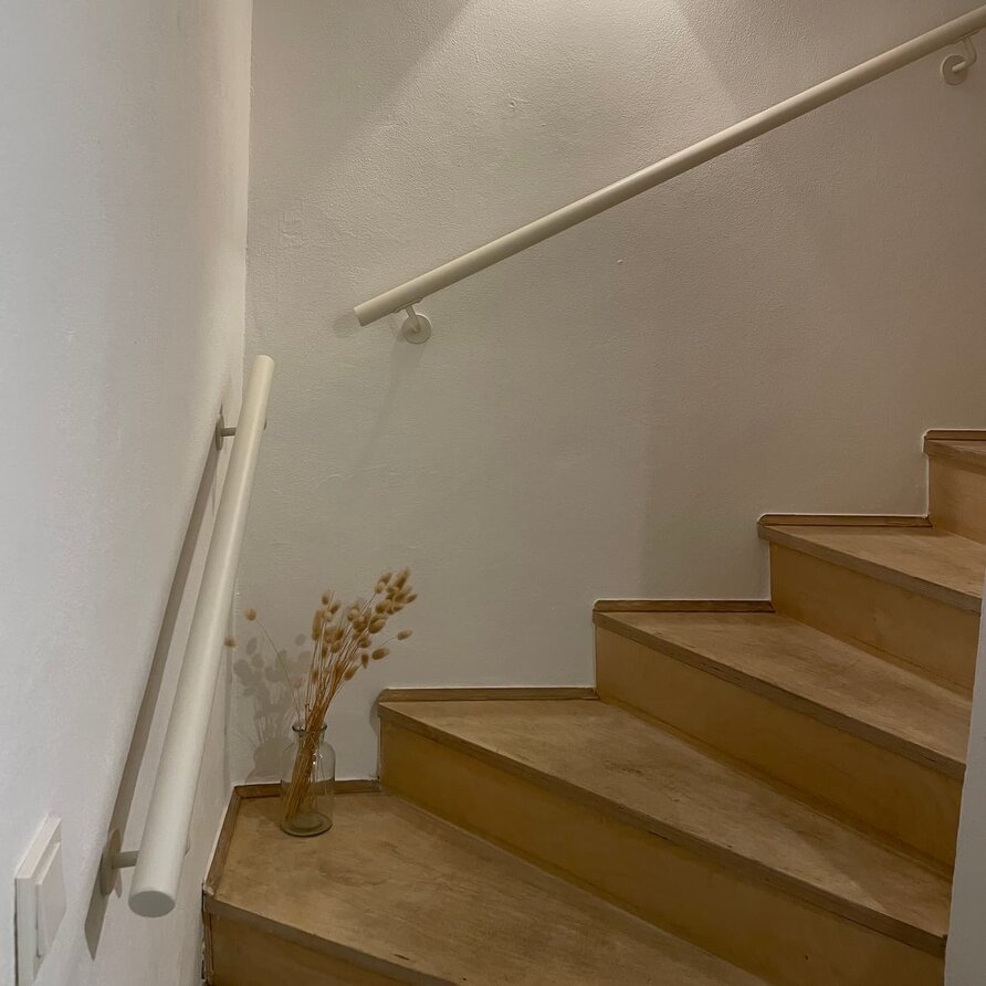 Handlauf weiß Komplettset - rund - inklusive Handlaufträger Typ 3 + Befestigungsmaterial - nach Maß - von 30 cm bis 595 cm - Treppengeländer Metall mit weißer Pulverbeschichtung fein strukturiert (matt) - RAL 9016, RAL 9010 oder RAL 9001. Ein runder Handlauf weiß mit einem Durchmesser von 42,4 mm. Dieser Handlauf aus Stahl ist mit einer weißen Pulverbeschichtung versehen. Hier können Sie wählen zwischen RAL 9016 (Verkehrsweiß), RAL 9010 (Reinweiß) und RAL 9001 (Cremeweiß). Ein handlicher runder Treppenhandlauf in Weiß aus Metall mit einem frischen Look, geeignet für ein breites Spektrum an modernen Einrichtungsstilen.