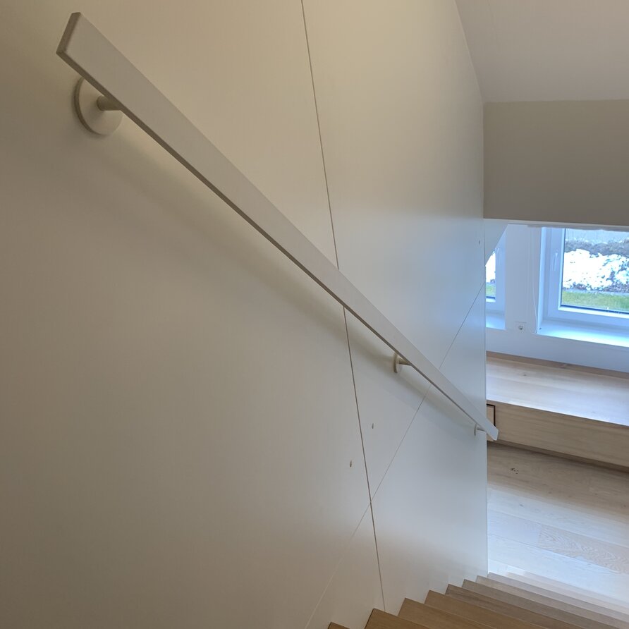 Handlauf weiß Komplettset - eckig (40x10 mm) - inklusive Handlaufträger Typ 5 + Befestigungsmaterial - nach Maß - von 30 cm bis 595 cm - Treppengeländer Metall mit weißer Pulverbeschichtung fein strukturiert (matt) - RAL 9016, RAL 9010 oder RAL 9001. Ein rechteckiger Handlauf weiß von 40x10 mm. Dieser Handlauf aus Stahl ist mit einer weißen Pulverbeschichtung versehen. Hier können Sie wählen zwischen RAL 9016 (Verkehrsweiß), RAL 9010 (Reinweiß) und RAL 9001 (Cremeweiß). Ein schlanker eckiger Treppenhandlauf in Weiß aus Metall mit einem frischen Look. Ideal geeignet für geradlinige Inneneinrichtungen.