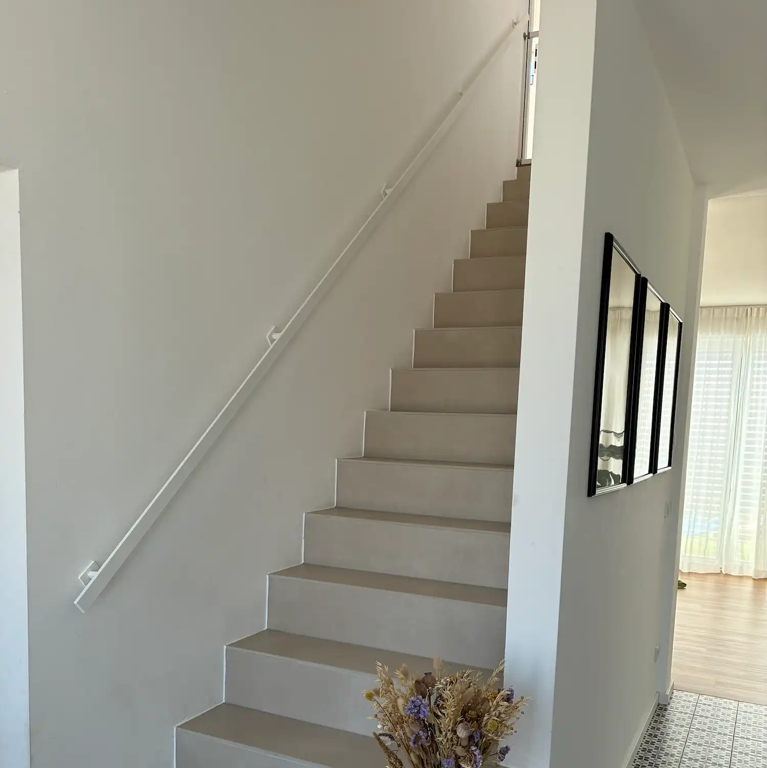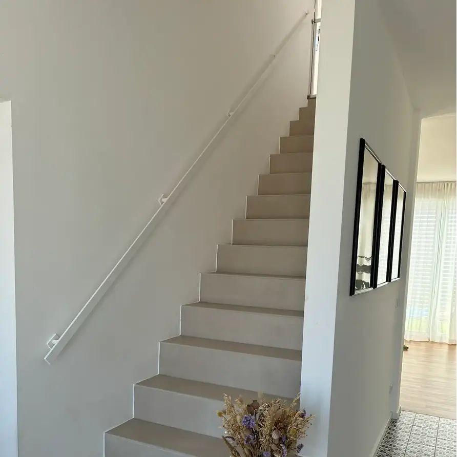 Dieser Handlaufträger wird in einer parallelen Linie zu dem Treppengeländer angebracht und hat eine besonders moderne, hochwertige Ausstrahlung. Dieser Treppen-Handlauf weiß eignet sich auch für eine horizontale und vertikale Positionierung. Stellen Sie sich zum Beispiel einen Handlauf auf einer gemauerten Treppenumrandung vor.