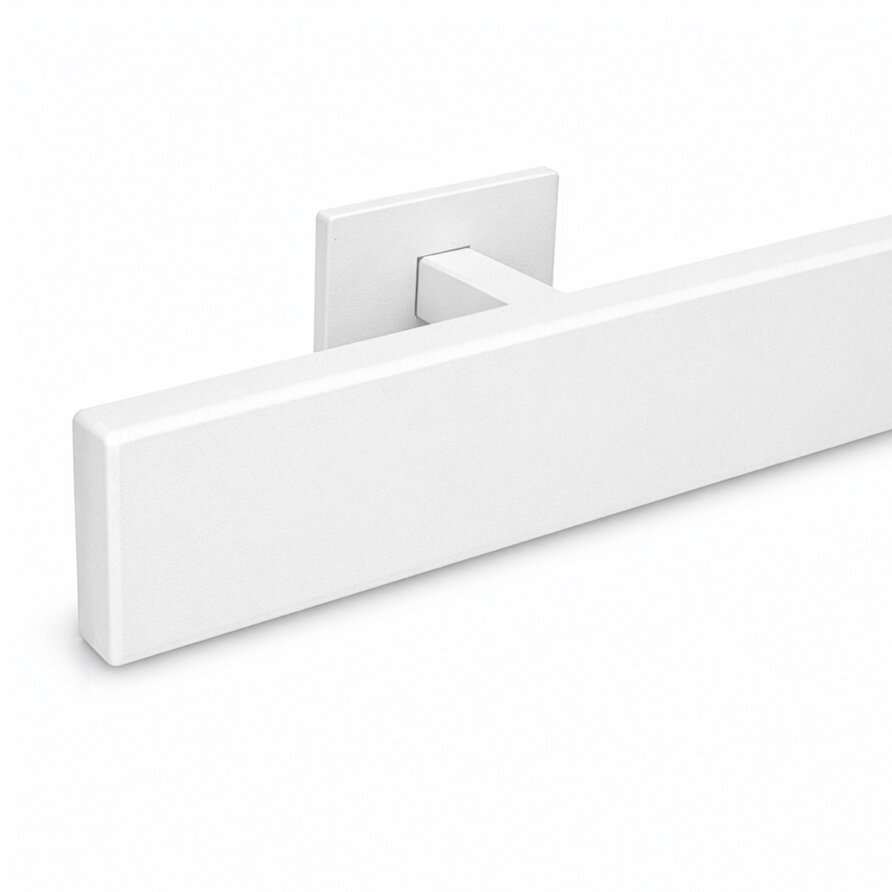 Ein rechteckiger Handlauf weiß von 40x10 mm: Ein schlanker Treppenhandlauf in Weiß aus Metall mit geradlinige Typ 16 Halterungen. Dieses Treppengeländer wird nach Maß gefertigt und mit den kompletten Befestigungsmaterialien geliefert. Lesen Sie mehr