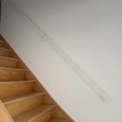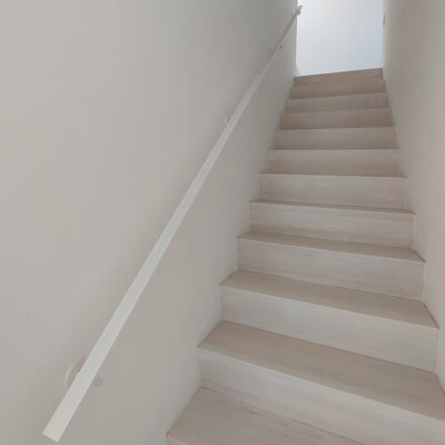 Handlauf weiß Komplettset - eckig (40x10 mm) - inklusive Handlaufträger Typ 3 Luxus + Befestigungsmaterial - nach Maß - von 30 cm bis 595 cm - Treppengeländer Metall mit weißer Pulverbeschichtung fein strukturiert (matt) - RAL 9016, RAL 9010 oder RAL 9001. Ein rechteckiger Handlauf weiß von 40x10 mm. Dieser Handlauf aus Stahl ist mit einer weißen Pulverbeschichtung versehen. Hier können Sie wählen zwischen RAL 9016 (Verkehrsweiß), RAL 9010 (Reinweiß) und RAL 9001 (Cremeweiß). Ein schlanker eckiger Treppenhandlauf in Weiß aus Metall mit einem frischen Look. Ideal geeignet für geradlinige Inneneinrichtungen.